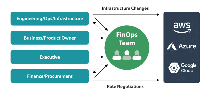 The following diagram illustrates an application of the FinOps model where the FinOps team (sometimes referred to as a cloud cost center of excellence) works with the rest of the company to manage cloud strategy, governance and best practices so that the rest of the organization can benefit from moving applications to public clouds.