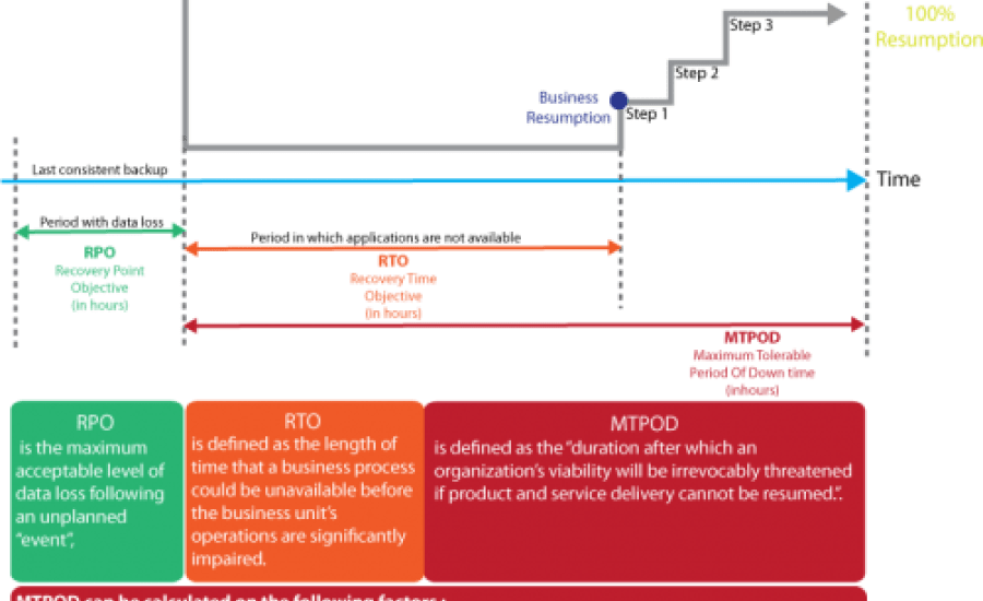 - MTPOD (max tolerable period of down time) - the maximum recovery time of the entire system, including the corrective steps after data recovery.