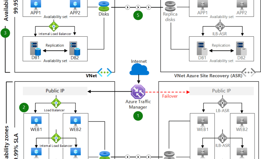 If you want to make applications truly robust and eliminate all possible risks (such as loss of datacenter), you need to architect the design of the components across regions and zones. At the same time, you have to choose automated deployment and redeploy in case of loss or damage. The following figure shows an example of an ASP.NET and SQL Server multi-tier architecture scenario in two SLA variants: