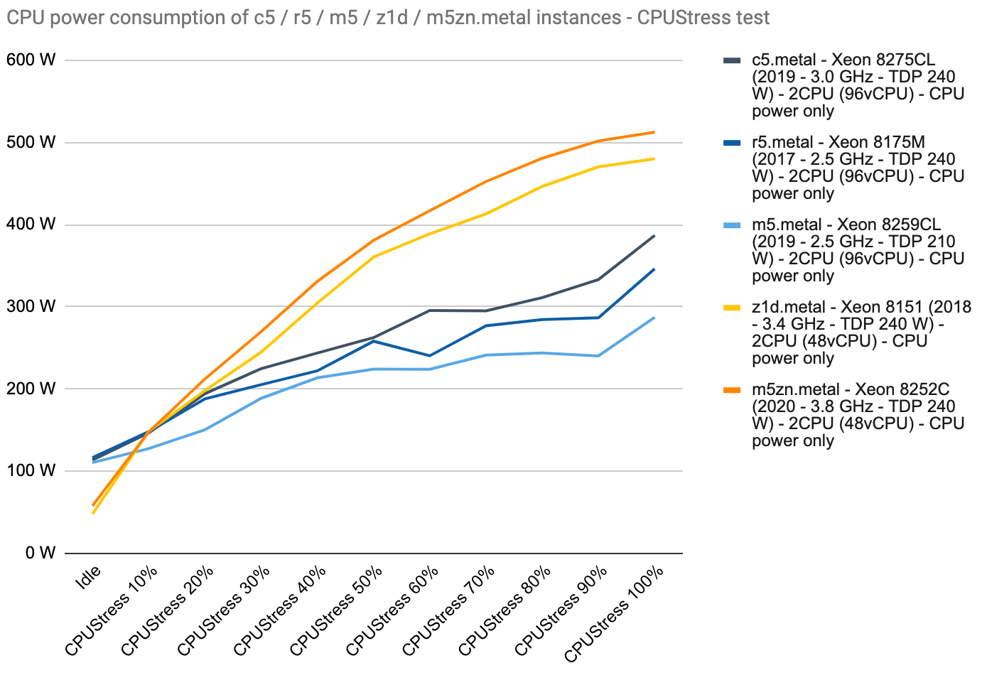 The graph shows a comparison of the power consumption of processors of different clock speeds, here in the AWS EC2 environment. The gains with a higher clock speed are reflected in the difference in power consumption of up to 200 W. Naturally, the cooling requirements increase accordingly.