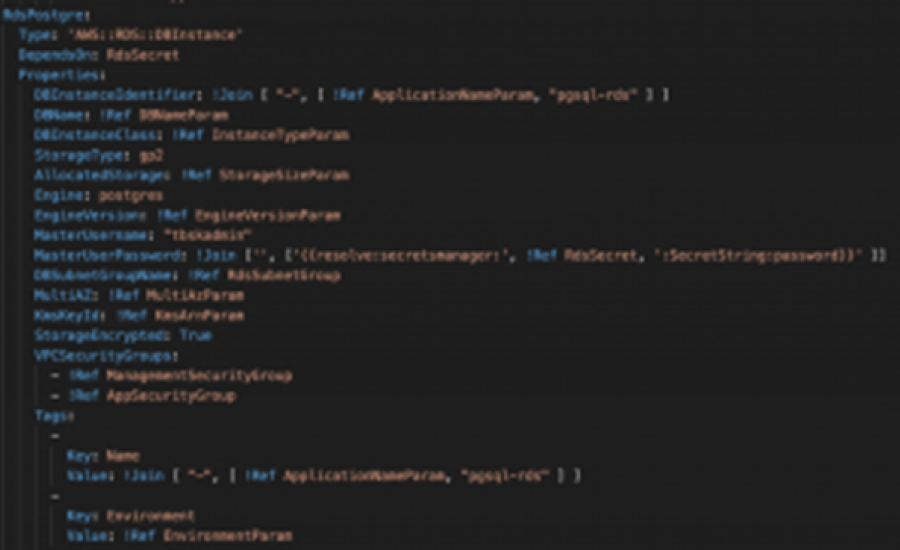 I'm getting ahead of myself: this example (simplified) shows what an IaC blueprint for a database (in an AWS environment, a blueprint defined by AWS CloudFormation) might look like: